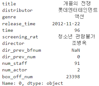 - 해당 코드는 각 행의 genre 피처의 값이 '액션'인지 여부를 확인하고, 결과를 Boolean값 (True 또는 False)로 반환한다.
