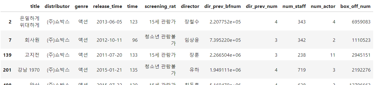 - 데이터프레임 df의 genre열의 값이 '액션'이면서 distributor열의 값이 '(주)쇼박스'인 행을 출력
