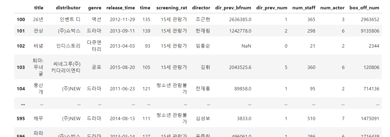 - df[(df['genre'] == '액션') & (df['distributor'] == '(주)쇼박스')]는 데이터프레임 df에서 genre열의 값이 '액션'이고, 동시에 distributor 열의 값이 '(주)쇼박스'인 행들만 선택하는 코드