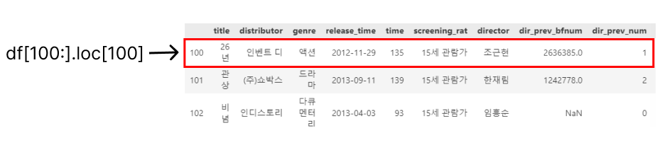- df[100:].loc[100]은