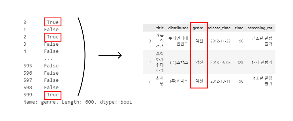 - 이 결과 genre가 '액션'인 행은 True로, 그렇지 않은 행은 False로 표시된다,