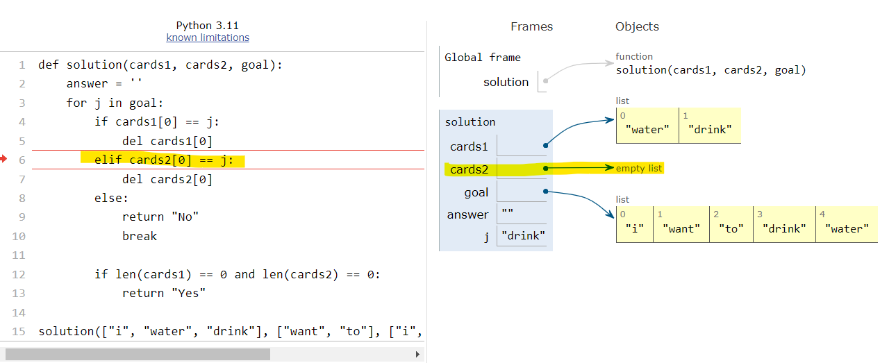 - 어차피 cards1에서 검사 했는데 cards2로 와서 비어있다고 에러가 나는건 No를 반환해야하는 경우이므로 elif 안에만 조건문을 하나 추가해주면 될 것 같다