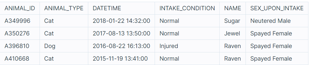 ANIMAL_INS 테이블은 동물 보호소에 들어온 동물의 정보를 담은 테이블입니다. ANIMAL_INS 테이블 구조는 다음과 같으며, ANIMAL_ID, ANIMAL_TYPE, DATETIME, INTAKE_CONDITION, NAME, SEX_UPON_INTAKE는 각각 동물의 아이디, 생물 종, 보호 시작일, 보호 시작 시 상태, 이름, 성별 및 중성화 여부를 나타냅니다.