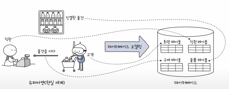 "데이터베이스 모델링이란 현실 세계를 데이터베이스 안에 넣기 위해서 테이블을 결정하는 과정"