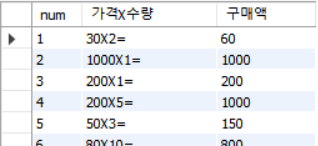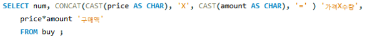 - 위의 경우 CHAR로 변경된 price와 X문자열과 CHAR로 변경된 amount, 마지막으로 =문자열을 이어준다