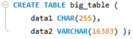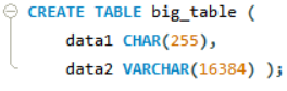 문제의 쿼리에서는 CHAR(255)와 VARCHAR(16383) 두 열을 사용하고 있는데, CHAR는 고정 길이 문자열이므로 항상 255바이트를 차지하게 됩니다. VARCHAR는 가변 길이 문자열이며, 주어진 데이터에 따라 실제로 차지하는 공간이 달라집니다. 이런 조합으로 인해 행 크기가 너무 커져서 발생한 것으로 추측됩니다.