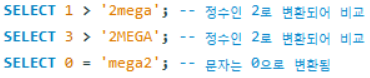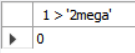 1. `SELECT 1 > '2mega';`: