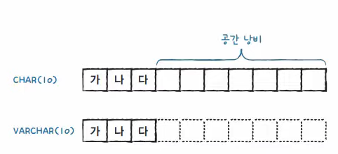 - CHAR: 3글자만 넣어도 내부적으로는 10자리를 잡는다