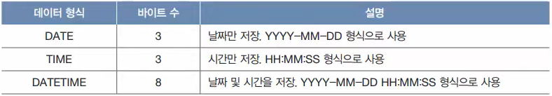 - 굳이 시간이 필요 없다면 굳이 DATETIME을 선택할 필요는 없다. DATETIME을 선택하는 것이 적절하다 (바이트수 고려)