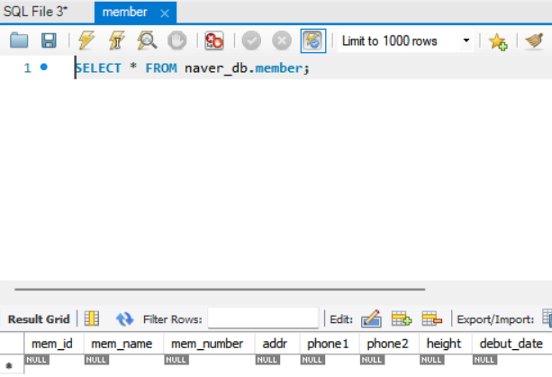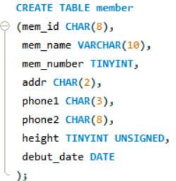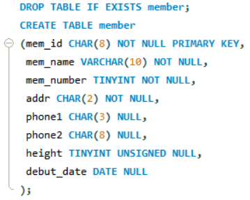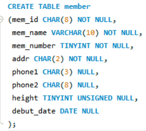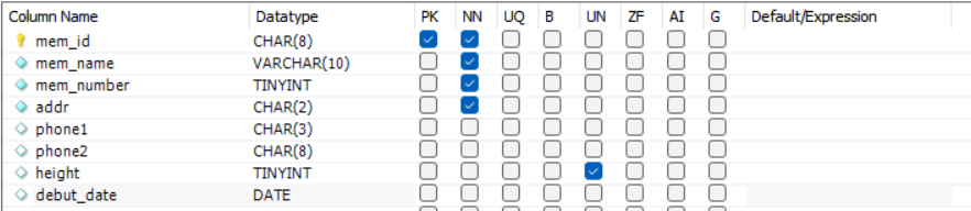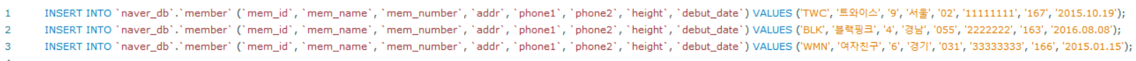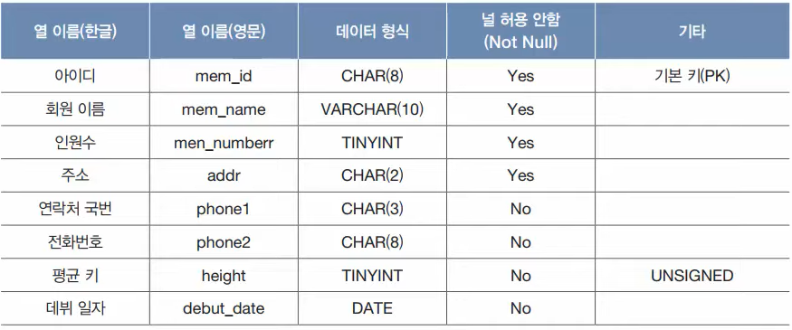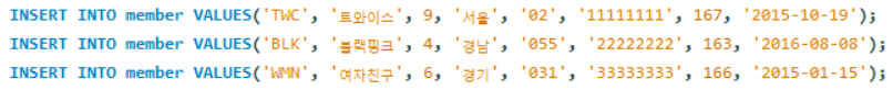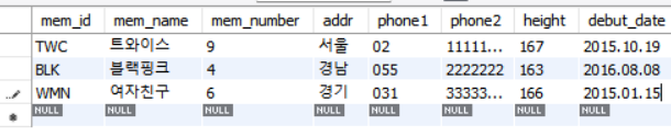 - 우리가 회원 테이블을 만들 때 '트와이스', '블랙핑크', '여자친구'데이터만 넣었다