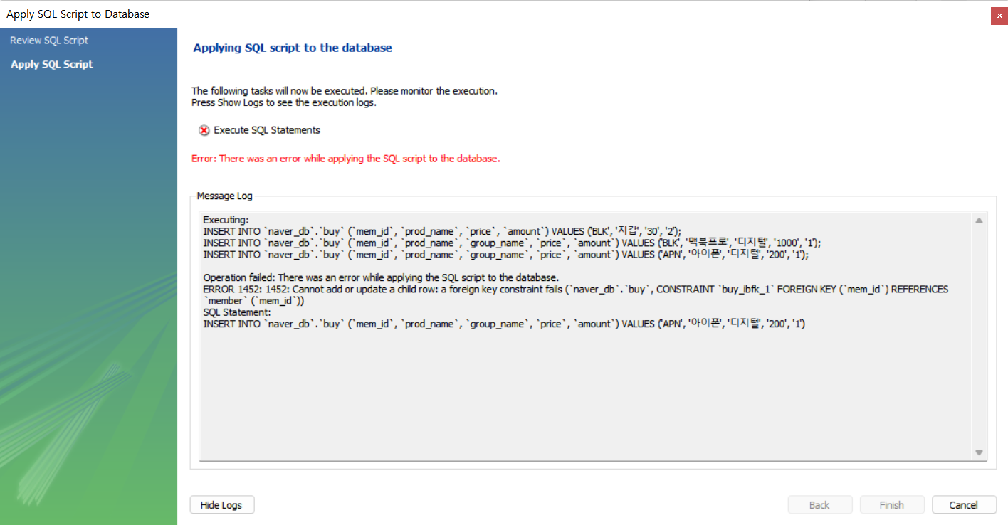 - 구매 테이블에서 회원 테이블에 없던 'APN'이 나타나 오류가 난 것