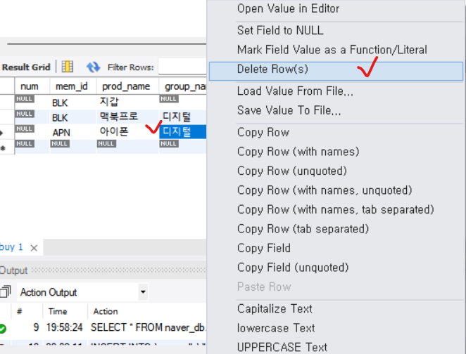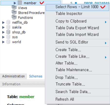 - 테이블에 마우스오른쪽 → 'Select Rows' 선택