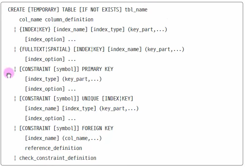 - GUI 방식 (마우스로 클릭)과 SQL문을 통한 방식이 있다