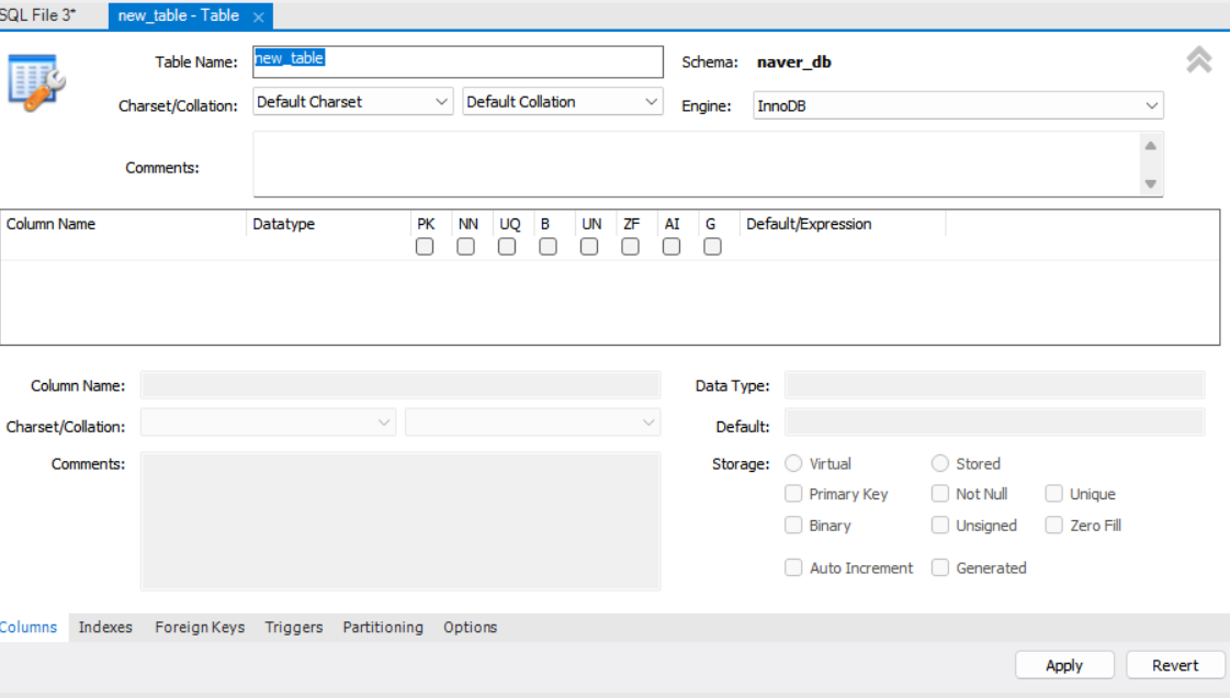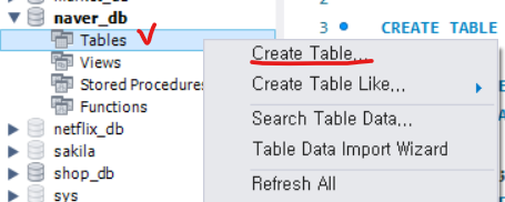 - naver_db를 열어 'Tables'를 마우스 오른쪽 클릭 → 'Create Table' 선택