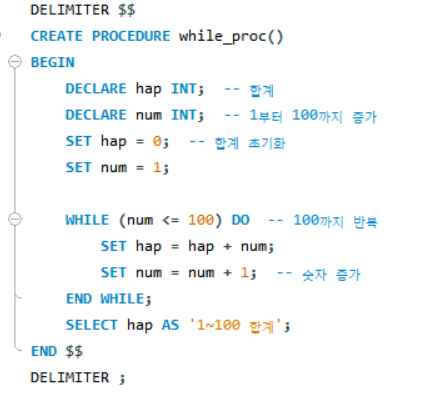 - DECLARE로 합과 증가할 숫자 변수 선언