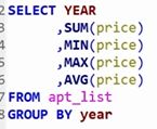 - 연도별 가격 합계, 최소값, 최대값, 평균