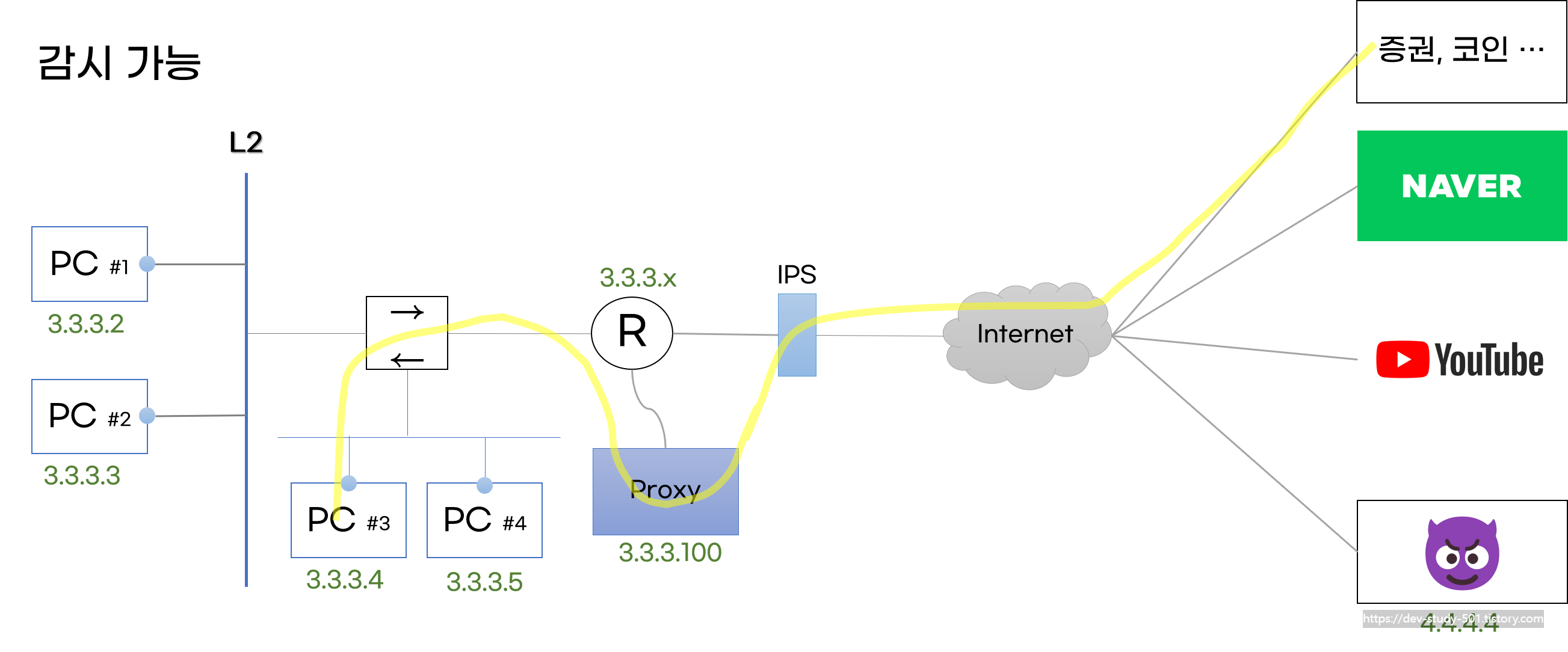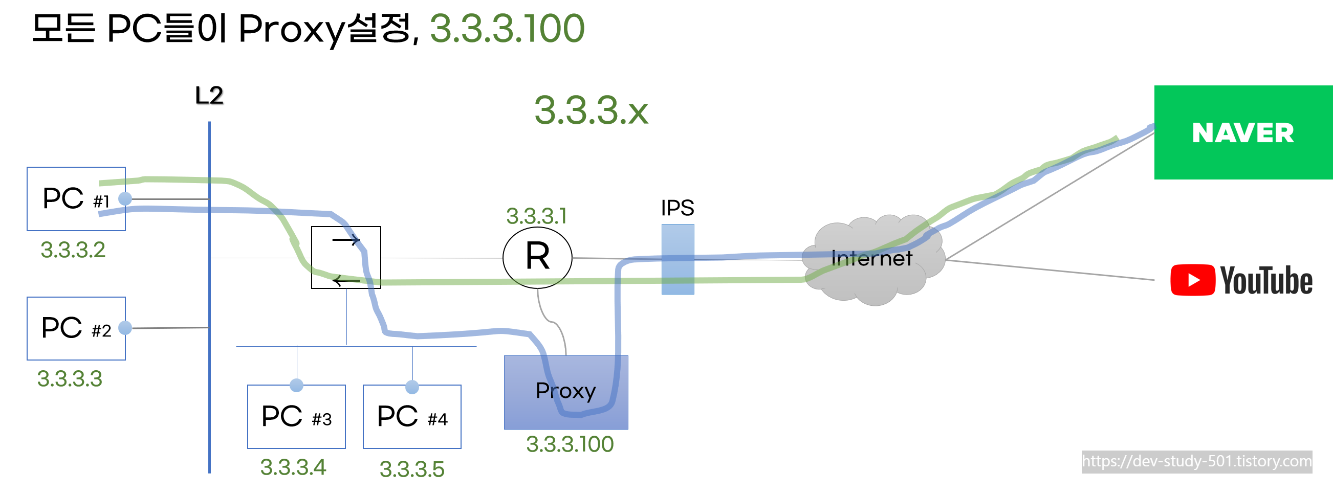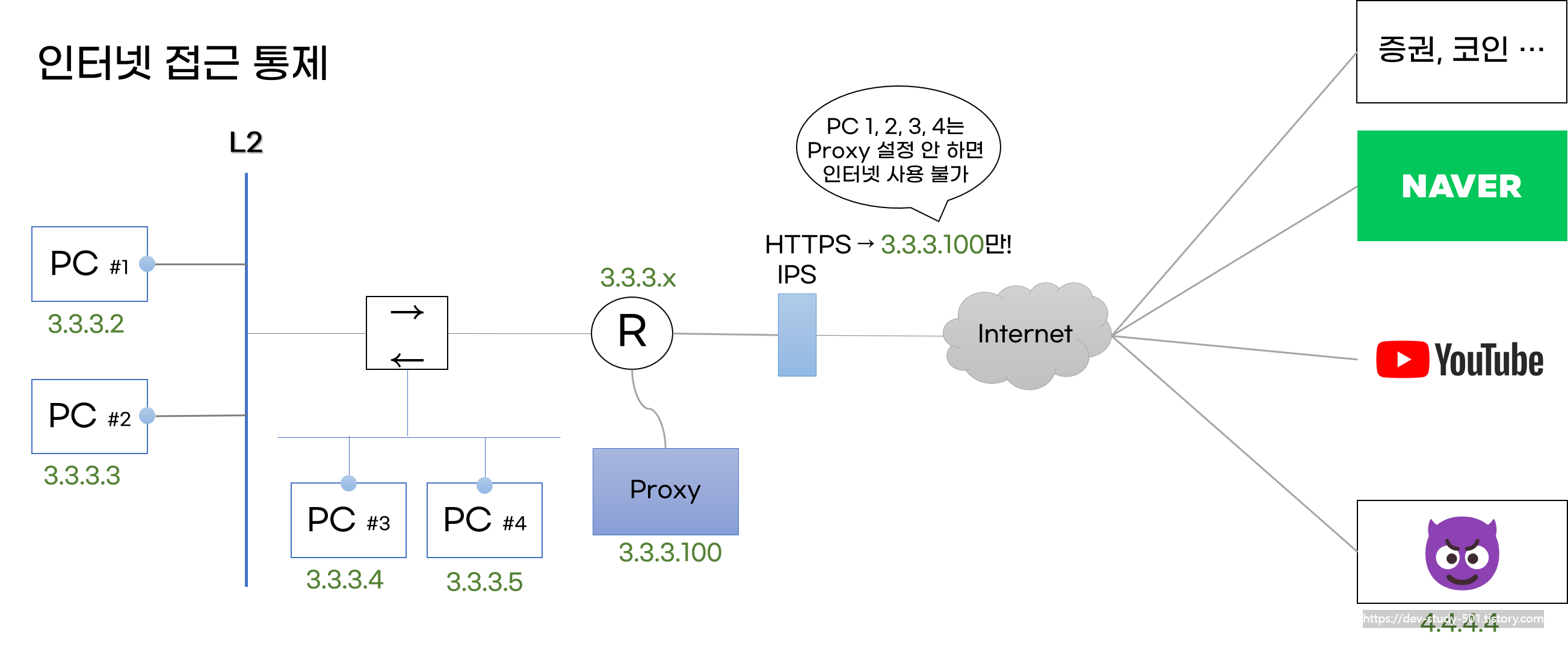 - 모든 PC들은 Proxy 설정(3.3.3.100)을 하고 있다고 가정
