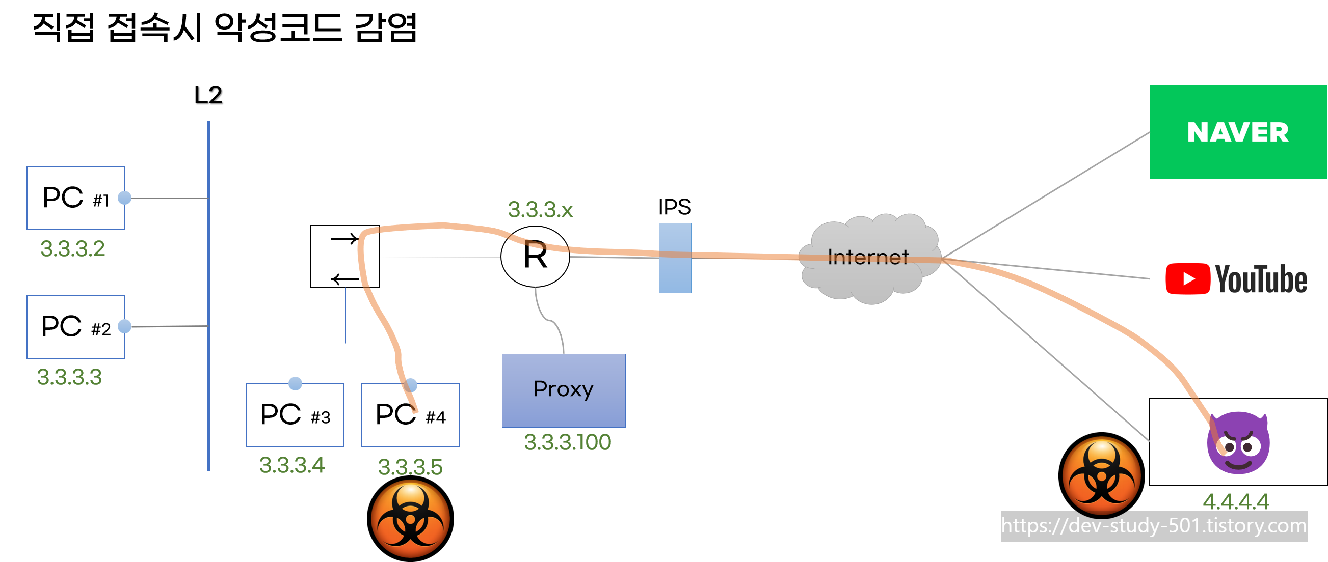 - Proxy 없이 악성 코드가 있는 사이트 접속시 바로 감염됨