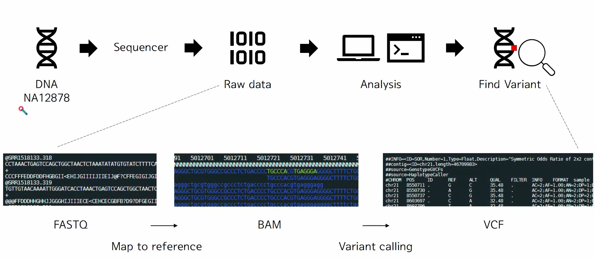 Genome Analysis Tutorial - Intro ❗Public raw Data DNA에서 나타난 유전적 변이(Variant)들을 생물 정보학 툴을 사용해 리눅스 환경에서 찾아보고자 함 - NA 12878이라는 공공데이터 사용 raw데이터(미 가공 상태의 데이터)인 FASTQ에서 기준 서열이라고 불리는 refernce서열에 맞춰 BAM파일을 만든다 BAM파일에서 유전적 변이를 찾아내는 Variant calling 과정을 거쳐 VCF 파일을 만든다 📚배울 내용 및 강의 특징 리눅스 환경에서 DNA mutation (SNV, Indel)을 검출하는 파이프라인 제작 파이프라인을 구성하는 각 툴을 설치하는 방법 학습 각 툴들을 실행하여 분석 파이프라인을 완성하고 결과 파일을 생성 BWA2, GATK4와..